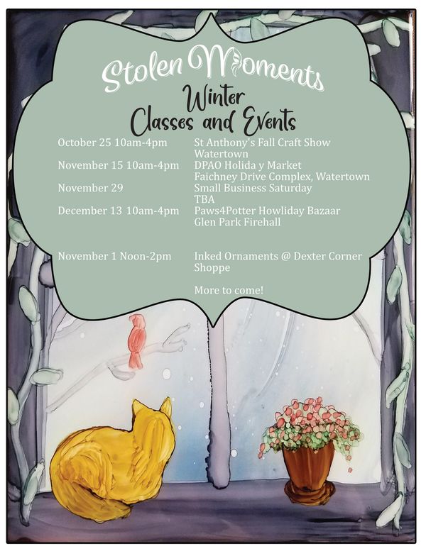 We'll be learning different techniques to ink 5 ornaments (glass, plastic and/or ceramic). You'll need to bring an egg carton to bring them safely home in, otherwise I supply everything.